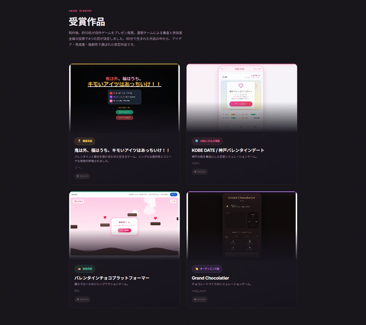 最優秀賞の「鬼は外、福はうち」は、バレンタインと節分を掛け合わせた豆まきゲーム。シンプルな操作性とユニークな発想が評価されました。大阪AI文化万博賞は神戸の街を舞台にした恋愛シミュレーションゲーム、審査員賞は横スクロールのジャンプアクション、オーディエンス賞はチョコレートづくりのシミュレーションゲームと、バレンタイン・節分のテーマの中でジャンルの多彩さが光りました。