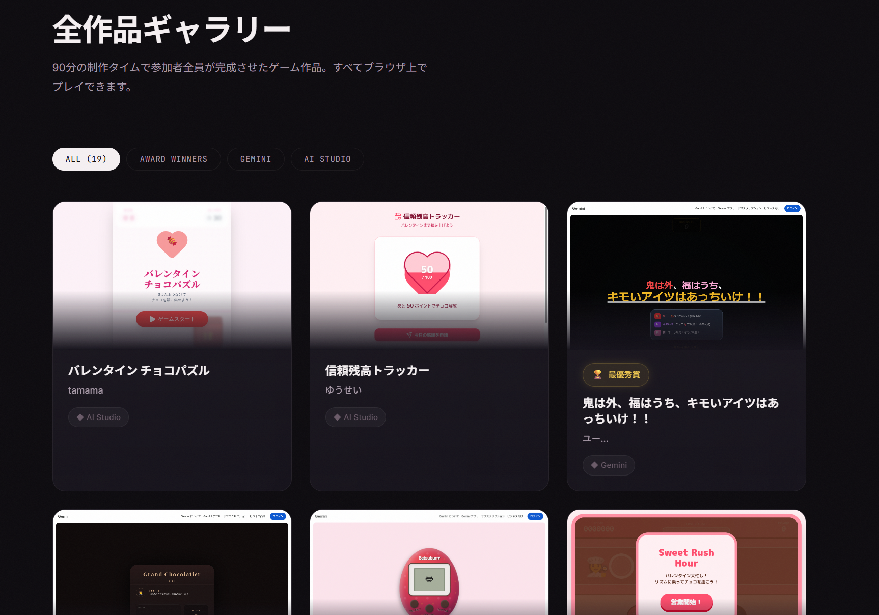 全21作品は、作品ギャラリーから実際にプレイできます。Google AI Studio(Gemini)の共有リンクとして公開されており、ブラウザ上ですぐに遊ぶことができます。