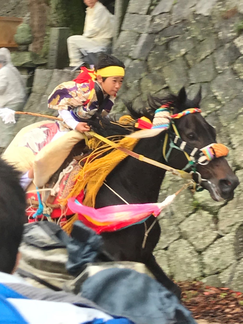 乗り子の少年たちは、落馬をすれば大怪我をするため、神事の1か月前から練習を重ね、1週間前からは古式にのっとり毎日海で禊ぎを行います。晴れ舞台の日には、家族が沢山の“お守り”を少年の体に取り付けます。頭に巻いた黄色い鉢巻きの中にも、お守りが縫い付けられています。家族の想いを胸に、少年たちは地域の伝統を守ります。子どもは地域の宝物。神馬に乗って参道を駆け上がる少年の想いは、これからも子に孫にと受け継がれていきます。