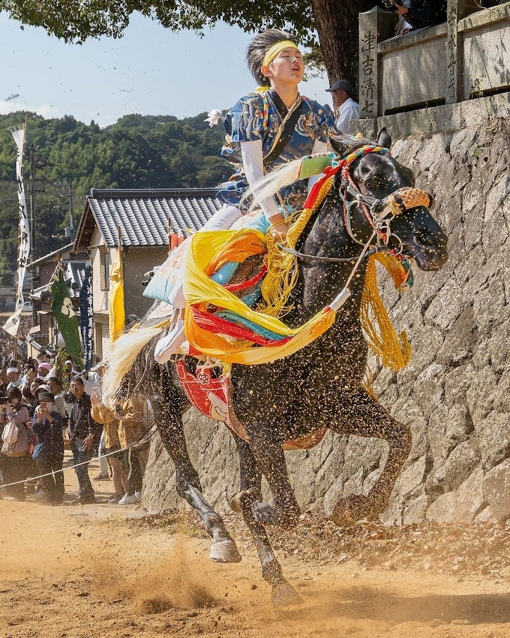 毎年10月第3週の日曜日、菊間町加茂神社の大祭で行われる「お供馬の走り込み」は、地元の少年たちが華やかに飾られた競走馬に乗り、境内の参道を疾走する国内ではここだけでしか見られない勇壮な伝統行事です。乗り子と神馬が見せる息の合った疾走は圧巻。その舞台裏には、競走馬を引退したサラブレッドと伝統文化を受け継ぐ人々の物語があります。地域の想いが紡いできた「お供馬の走り込み」にぜひご注目ください。