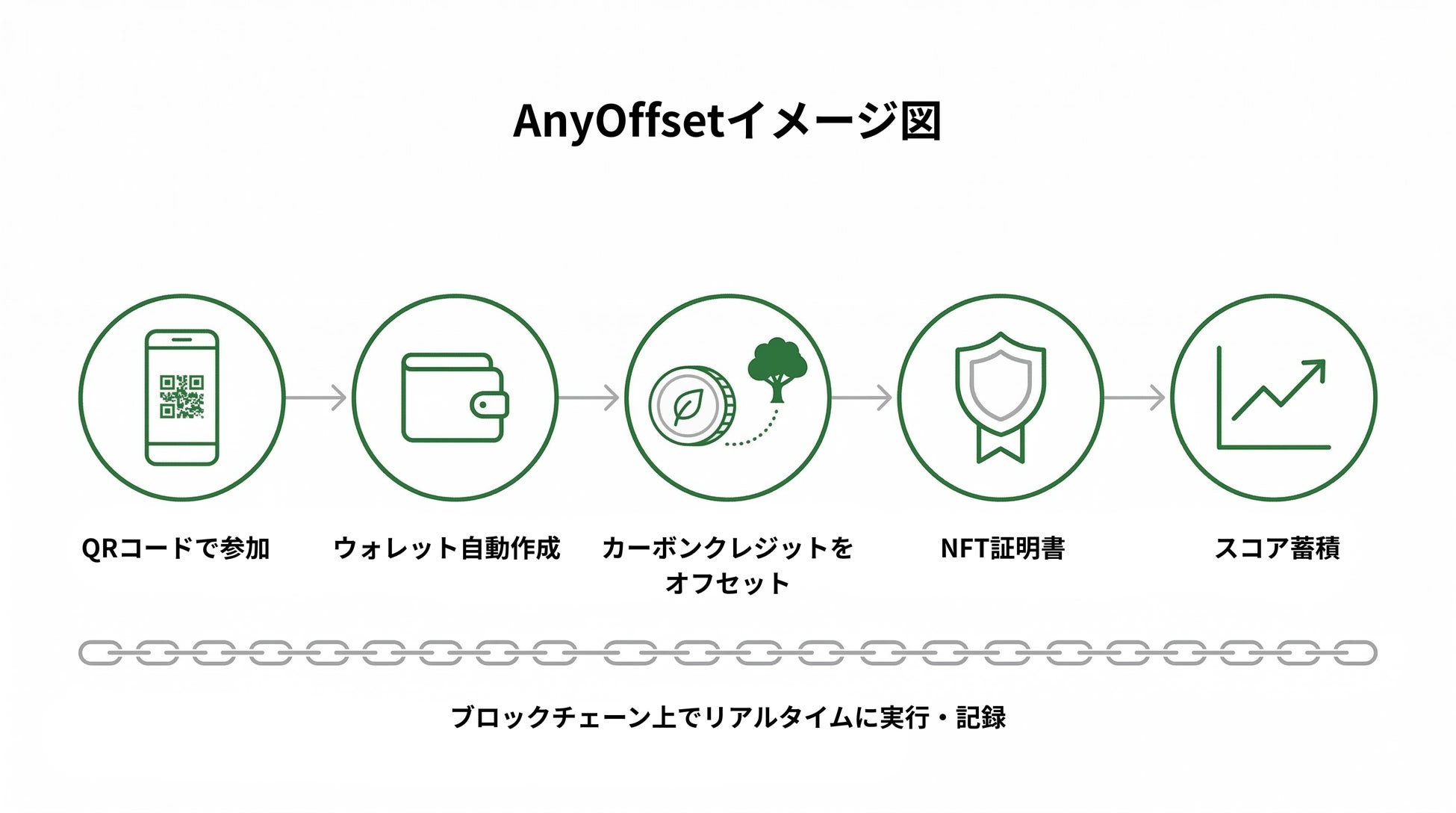 AnyOffsetを活用することで、企業が必要とするカーボンクレジットの調達に一般市民を巻き込む新たな仕組みを構築できます。企業がオフセットキャンペーンを展開し、消費者やイベント参加者が自らオフセットに参加することで、企業の脱炭素目標の達成と市民の環境意識向上を同時に実現します。従来のBtoB取引に限定されていたカーボンクレジット市場に、BtoCの接点を生み出すことで、市場全体の活性化にも寄与します。