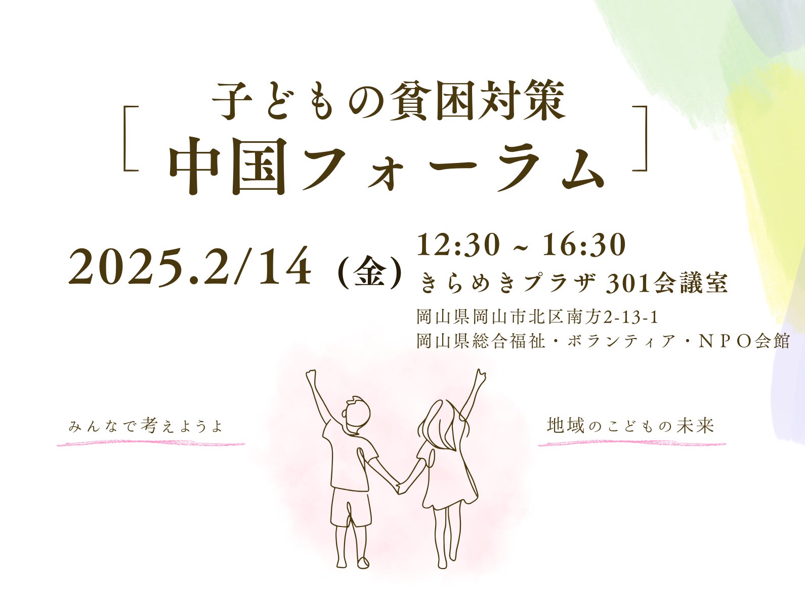 子どもの貧困対策に取り組んでいる「公益財団法人あすのば」は(事務所:東京都港区赤坂 代表理事:小河 光治)は、子どもの貧困対策 中国フォーラムを2025年2月14日(金)に開催します。このイベントは、中国地域で子どもを支えることをテーマに開催します。新たなコミュニティの形成と交流の促進を目指しています。