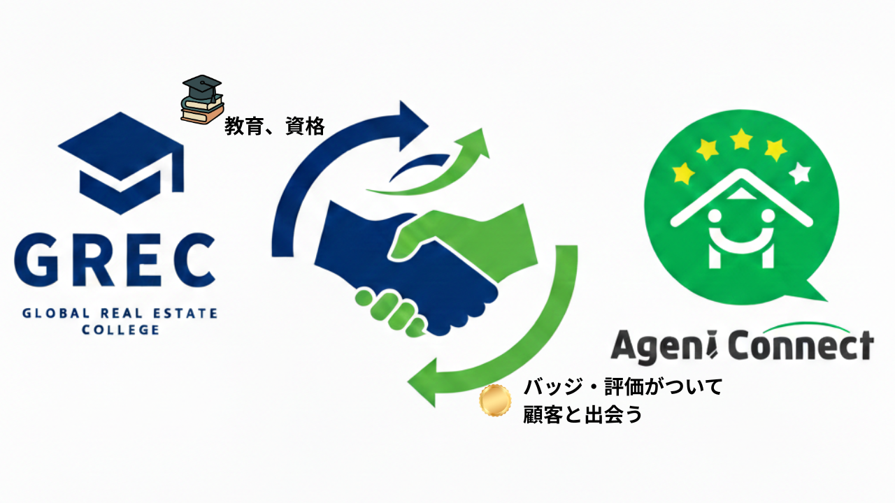 2010年より国際不動産教育を牽引してきた「GREC」と、エージェントと顧客の最適なマッチングを実現する「Agent Connect」がタッグを組むことで、「学び(教育)」を「稼ぐ力(実務)」へと直結させる環境を構築し、不動産業界の新たなキャリアモデルを創出します。