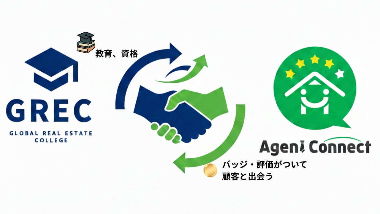 国際不動産カレッジ(本部:東京都千代田区、運営会社:株式会社リアルエステート・エージェント・ジャパン 代表取締役 杉浦 隼城、以下「GREC」)と、不動産エージェントの比較プラットフォームを展開するAgent Connect株式会社(本社:東京都新宿区、代表取締役:冨谷 皐介、以下「Agent Connect」)は、グローバルに活躍できる不動産人材の育成およびキャリア支援を目的とした業務提携を締結いたしました。