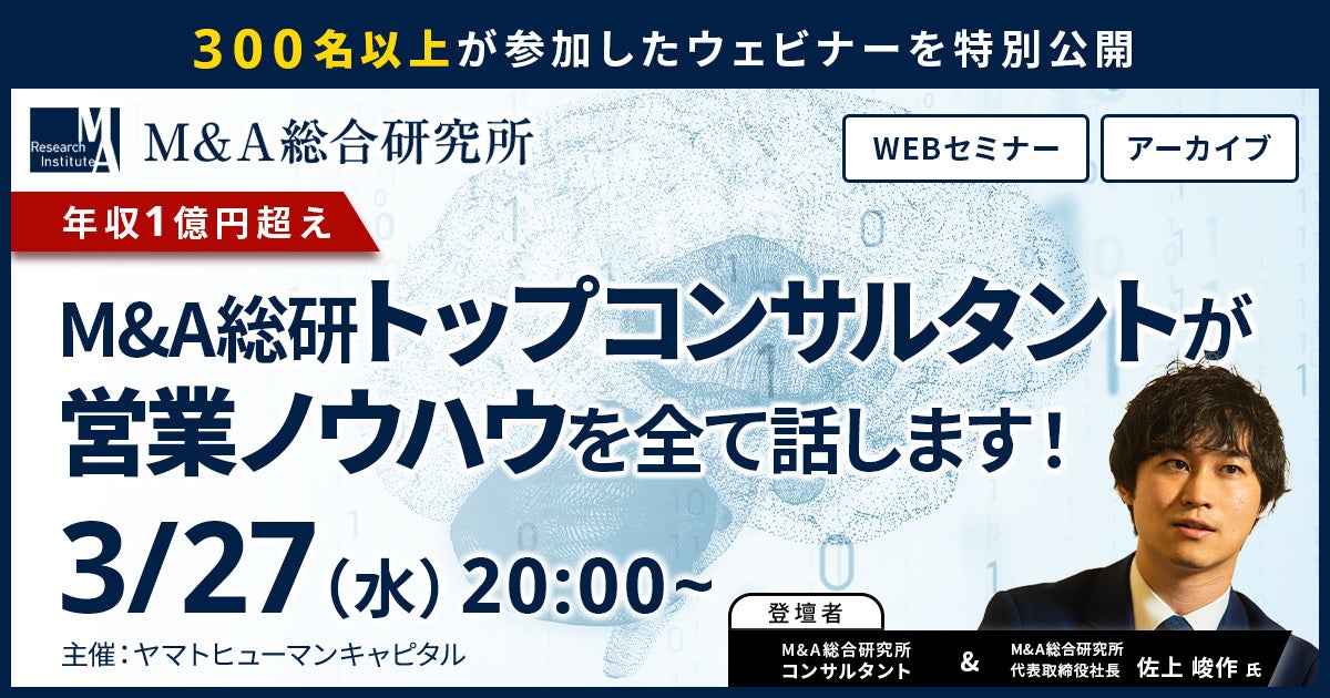 ヤマトヒューマンキャピタル株式会社(本社:東京都千代田区、代表取締役:堀江 大介)は、2024年3月27日(水)20:00よりオンラインにて、株式会社M&A総合研究所代表取締役社長佐上峻作氏にご登壇いただくウェビナー『 M&A総研トップコンサルタントが営業ノウハウを全て話します!』を開催いたします。