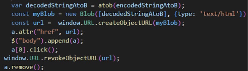 攻撃者は、実際のフィッシングページを無害なウェブページの内部にブロブとして埋め込みました。このフィッシングページは、コードを難読化し、静的検出を回避するために、まずbase64で暗号化され、さらに複数回暗号化されます。このブロブをエンドポイントでアクセス可能にするために、攻撃者はcreateObjectURL() メソッドを用いてブロブURLを作成します。その後、click() メソッドを用いてブロブURLを疑似的にクリックします。