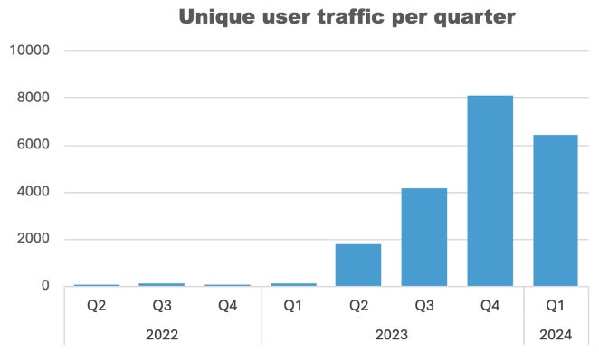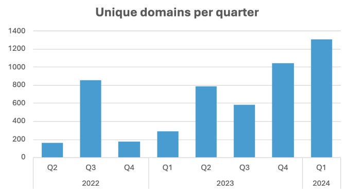 同時に、フィッシングの対象となったNetskopeユーザーがアクセスを試みている悪意あるアプリケーションのユニーク数も増加しています。各アプリケーションには、https://{application-name}.workers.devという形式のユニークなドメインが割り当てられます。下図は、ユニークなドメイン数が2023年と2024年に増加を続け、現在も伸長していることを示しています。