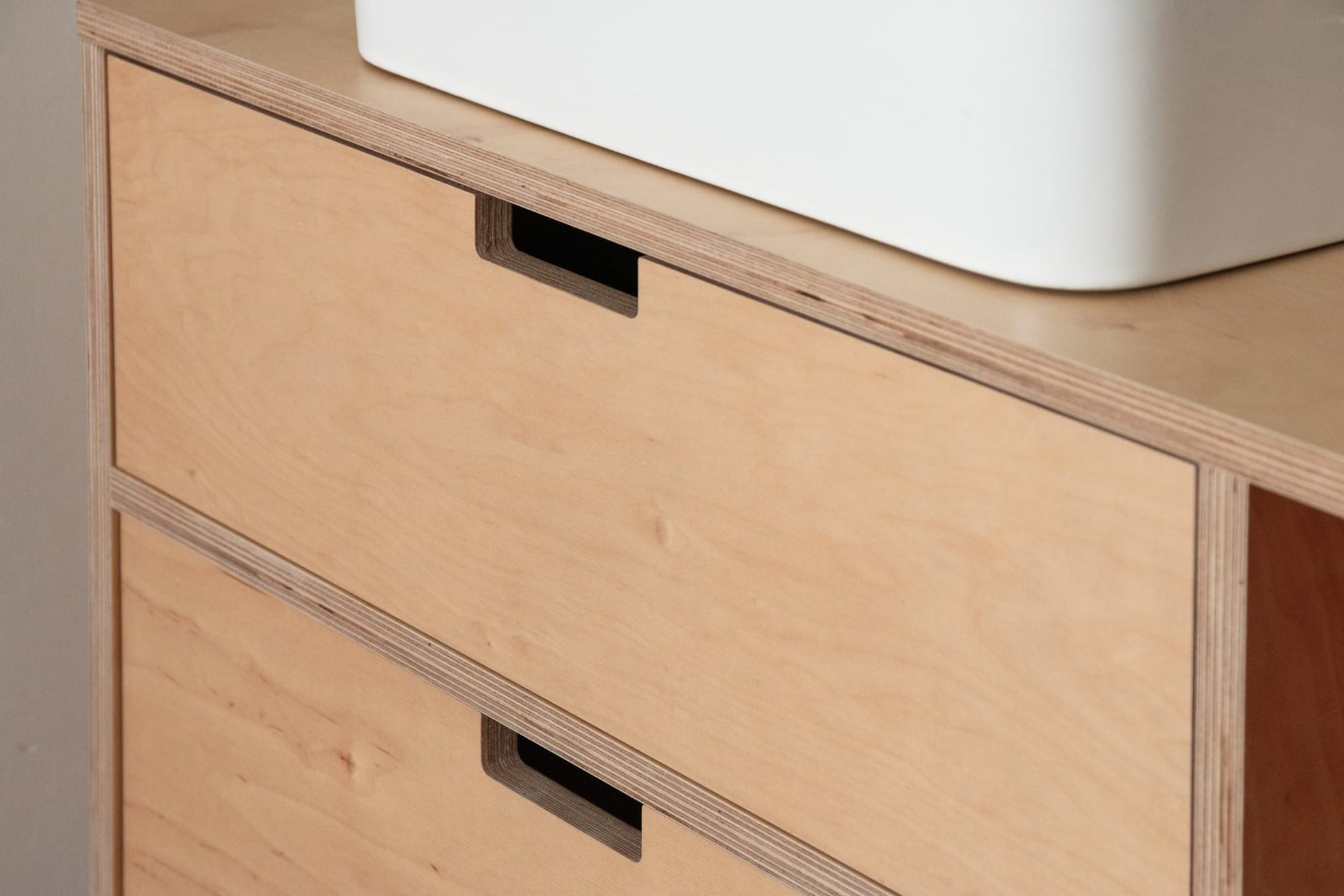 当社は、このDAP加工に着目。見た目はプライウッドの素材そのままの風合いを楽しみながら、水に強く、プライウッドだから出来る「積層断面見せの切りっぱなし」をデザインに落とし込むことが可能となりました。収納部の扉は、断面を隠さないよう、あえてインセットで納めて、グリッド感を強調。手掛けも四角く切り抜いただけにしています。