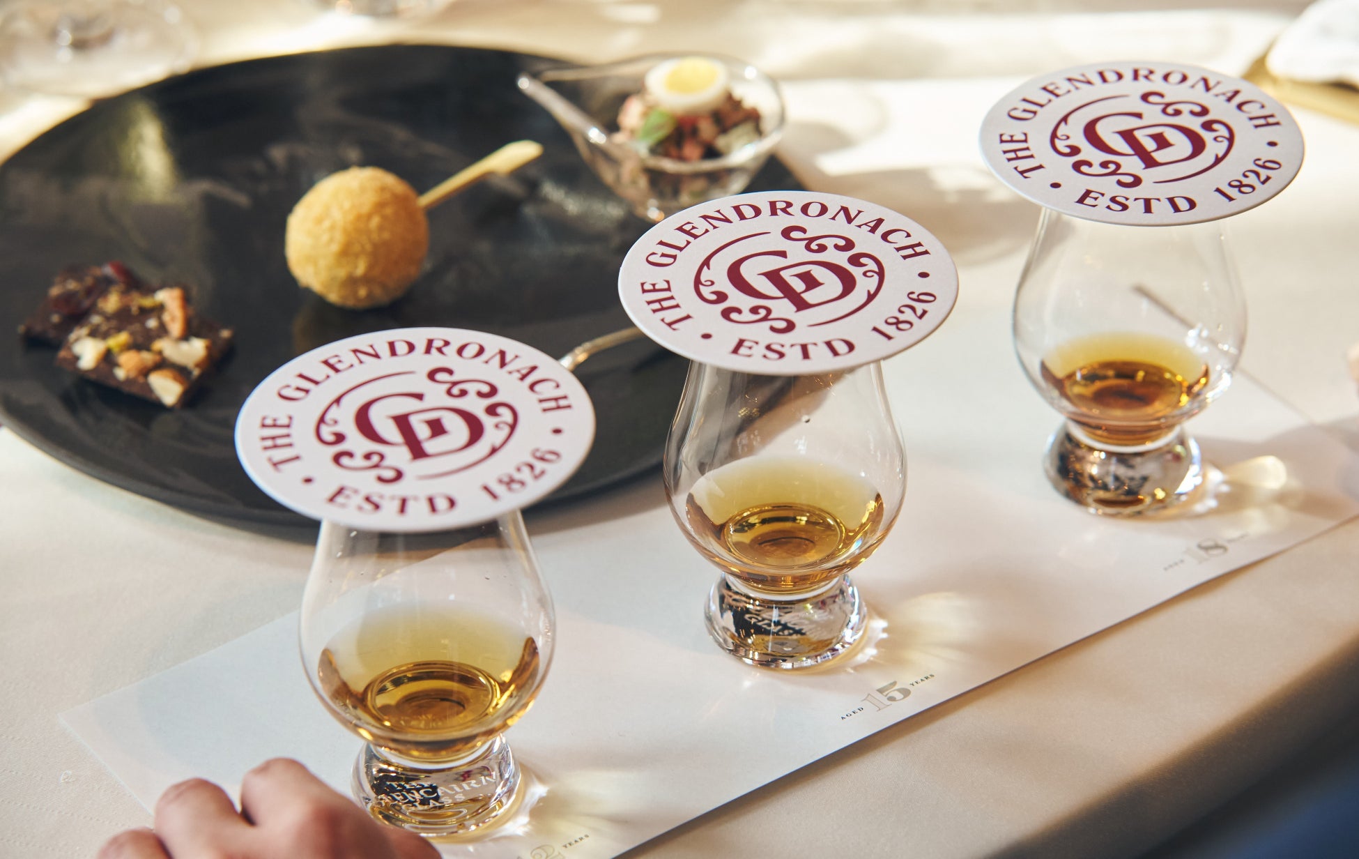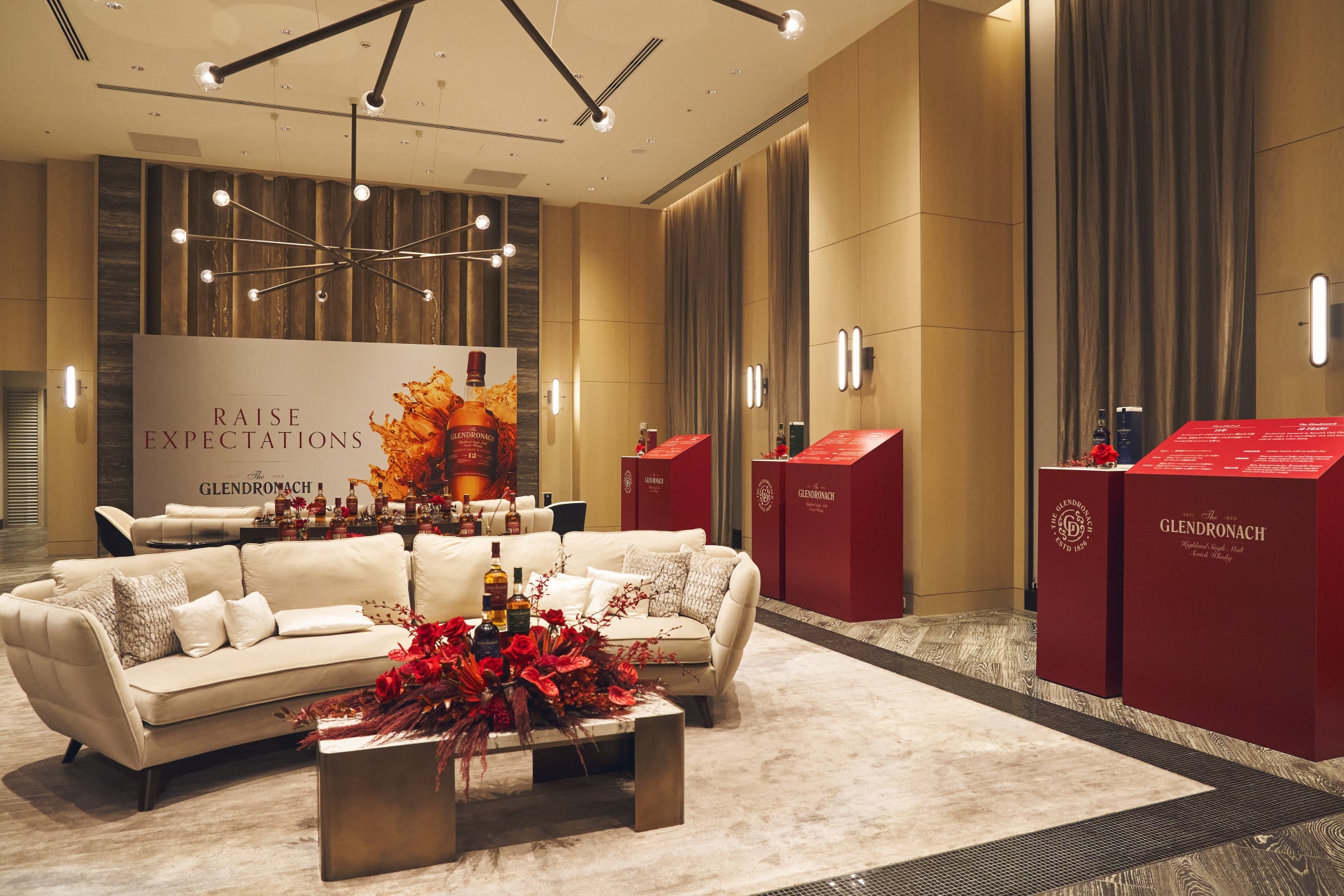 会場内は、エレガントで力強いフレーバーを表現する、深紅を基調とした華やかな装飾で彩られました。パッケージリニューアルされた「グレンドロナック 12年」「グレンドロナック 15年」「グレンドロナック 18年」もディスプレイ。クラシカルさとモダンなラグジュアリーを見事に融合させたデザインは、骨太なハイランド・スピリッツの伝統とスペインのセンスを体現し、深みと華やかさをもたらしています。
