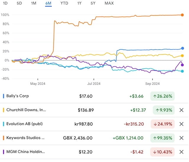 これらの結果を踏まえると、2024年上半期はBally’s CorpやKeywords Studiosの成長が目立つ一方、Evolution ABやMGM China Holdingsは規制や外部要因に影響を受けていることがわかります。