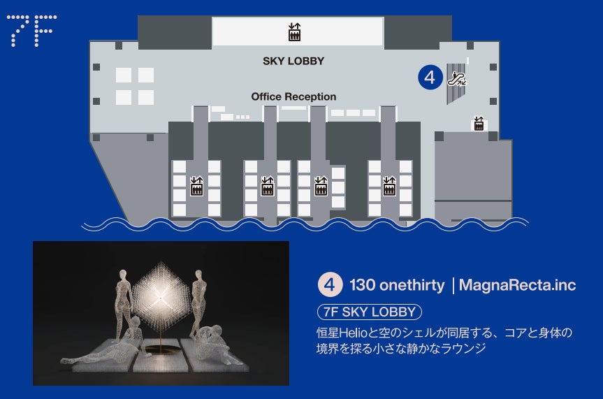 本展で130が発表するのは、新作インスタレーション《Core Shell Lounge》です。 多層グリッド構造を持つランプ《Helio》を「コア(核)」とし、その光に引き寄せられるように、表層の網目だけで構成された「シェル構造の人」が周囲を取り囲みます。