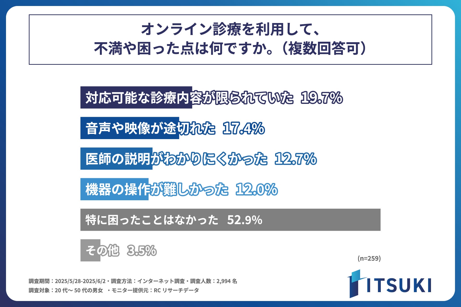 オンライン診療を利用して、不満を持ったり困ったりした点は、「対応可能な診療内容が限られていたこと」や「音声や映像が途切れたこと」