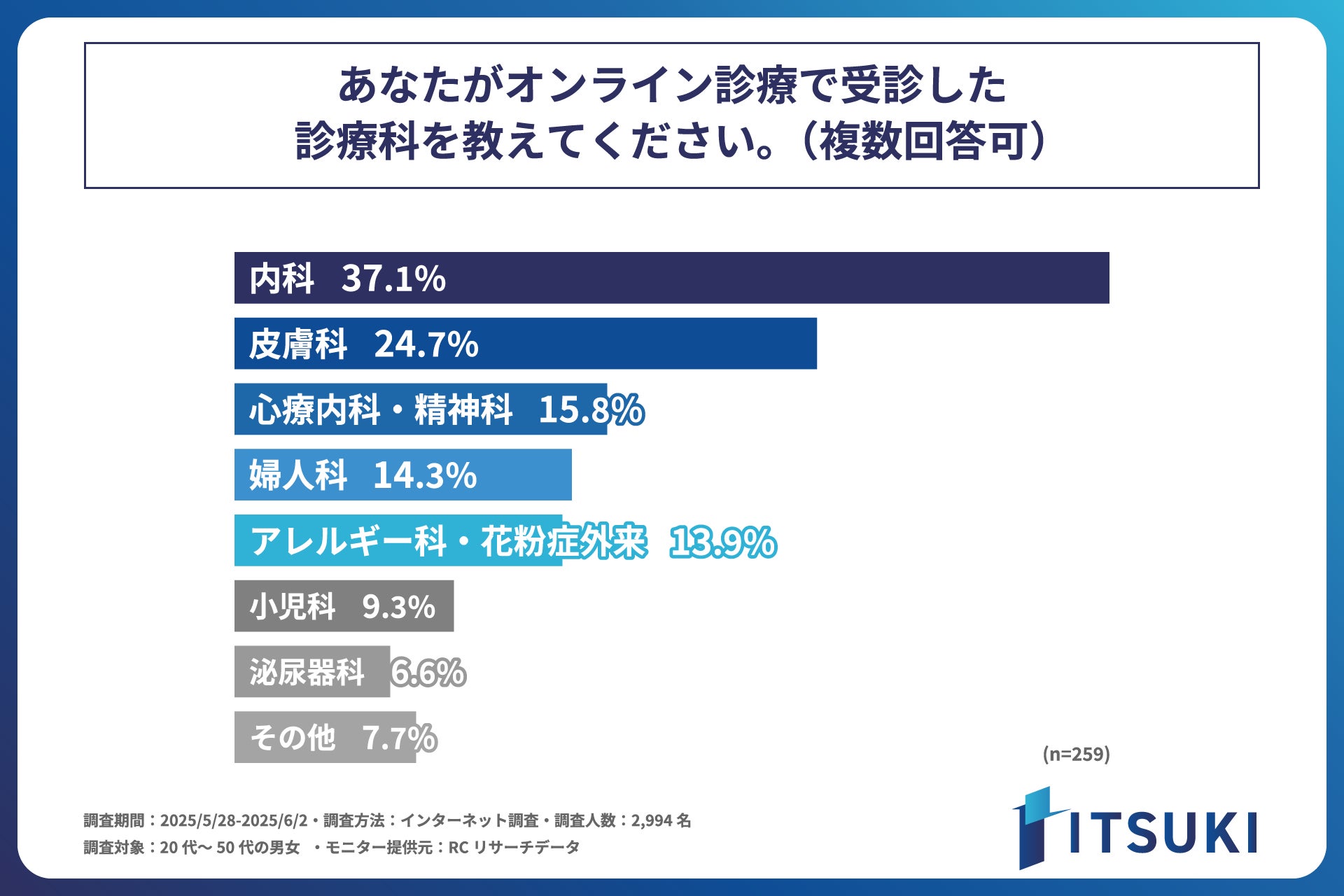 次に、オンライン診療を利用したことがある人を対象に「オンライン診療で受診した診療科」を尋ねる設問への回答では、1位が「内科」で37.1%、2位が「皮膚科」で24.7%、3位が「心療内科・精神科」で15.8%という結果になりました。この結果から、オンライン診療を利用したことがある人がオンライン診療で受診した診療科として最も多いは「内科」であることが判明しました。