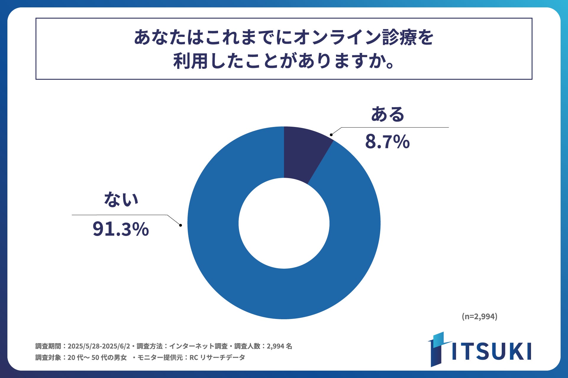 インターネット回線事業を行う株式会社ITSUKI(本社:東京都北区、代表取締役:岩下 一樹)は、20代~50代の男女を対象に「オンライン診療」に関する調査を実施しました。この調査から、20代~50代の男女のオンライン診療の利用に関する実態などが明らかになりました。