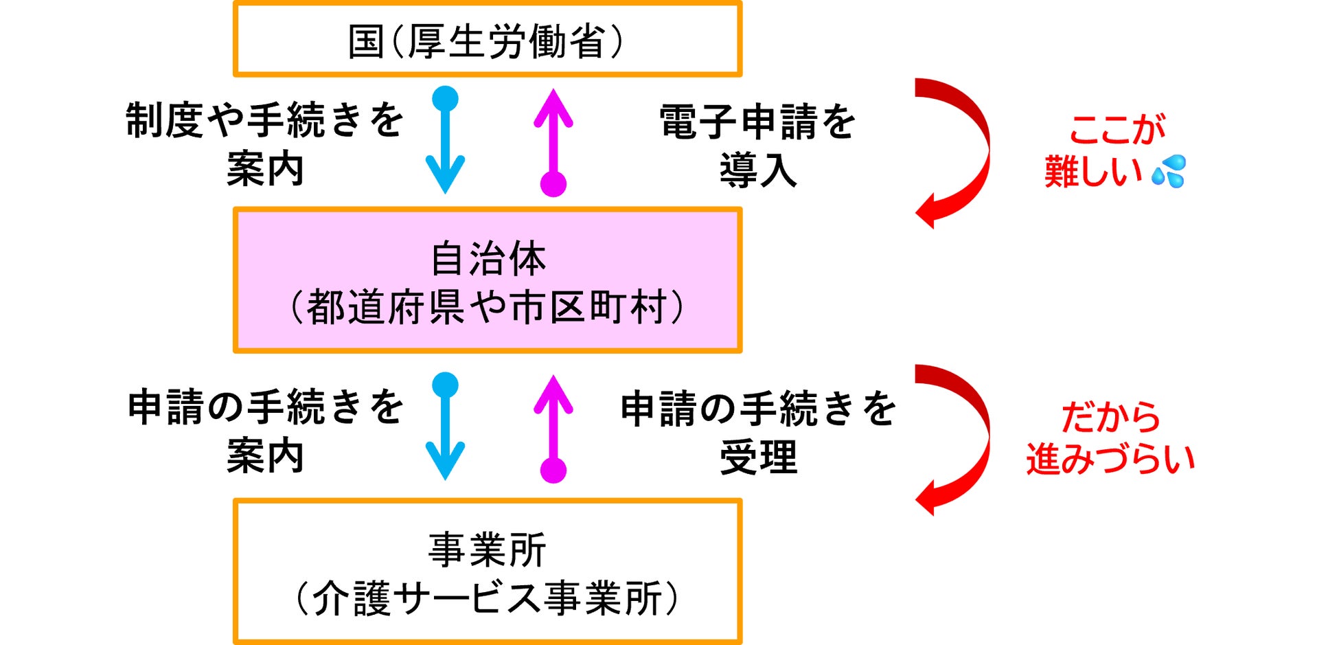 ・さらに自治体で電子申請を導入した際には、介護事業所に向けて電子申請の方法を案内していく必要があり、ここでも難しい内容や手続きが含まれているため、事業所目線で分かりやすく説明しないと、電子申請が利用されないネックも抱えています。