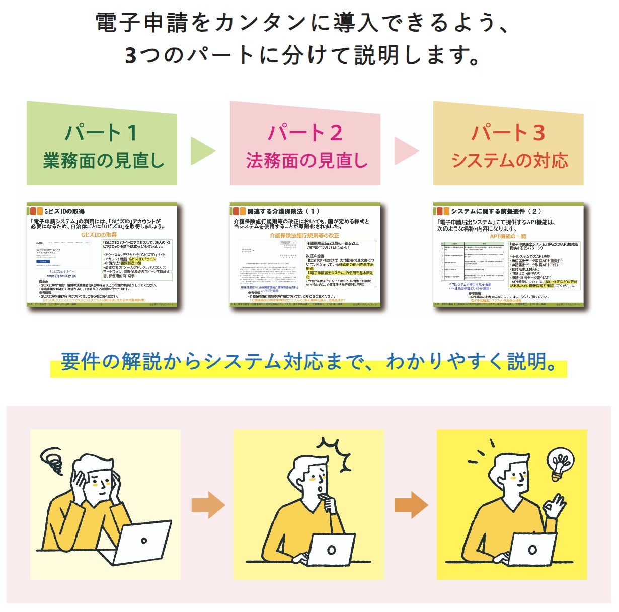 ・自治体の介護保険課の方には、これまでに通常業務に加えて、電子申請の導入向け資料を見ながら、電子化のために自治体の条例の一部改正やデータベースを連携するプログラム実行など、自治体の法務部門やシステム部門と連携した働きが求められます。