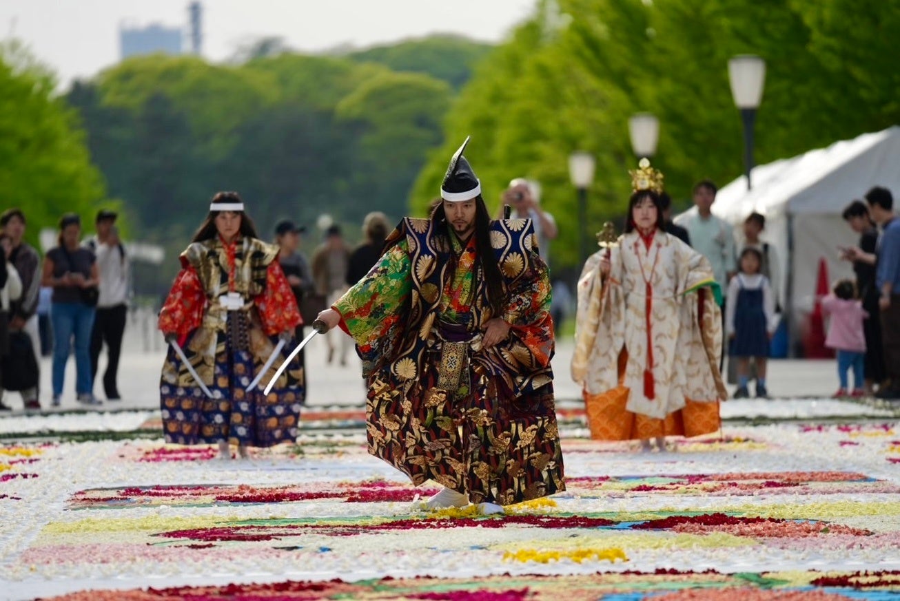 本イベントは、東京都港湾局主催、一般社団法人花絵文化協会共催により、シンボルプロムナード公園 ウエストパークブリッジ を会場に、5月9日〜11日、5月16日〜18日の2会期で実施。「フローラルフェスタ」の一環として、世界最大級の噴水「東京アクアシンフォニー」を背景に、1st Sessionでは110㎡の巨大和文様フラワーカーペットを、2nd Sessionでは歌川国貞の浮世絵をモチーフにした花歌舞伎4作品を、それぞれ事前に公募した約100名の市民参加者とともに制作します。使用する花材は合計約47,000本のカーネーション。さらに1st Session最終日には、完成した花絵を舞台に、武楽創始家元の源光士郎による武楽公演を実施し、日本文化が響き合う特別な時間を創出します。 総合監修は花絵師の藤川靖彦。