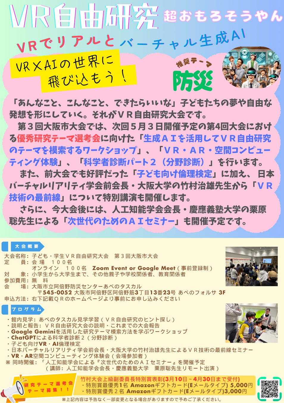 優秀な研究テーマには、大阪大学教授・竹村先生より特別賞が授与されます。子どもたちの独創的なアイデアとVR技術が融合した、未来の防災を担う研究にぜひご注目ください。