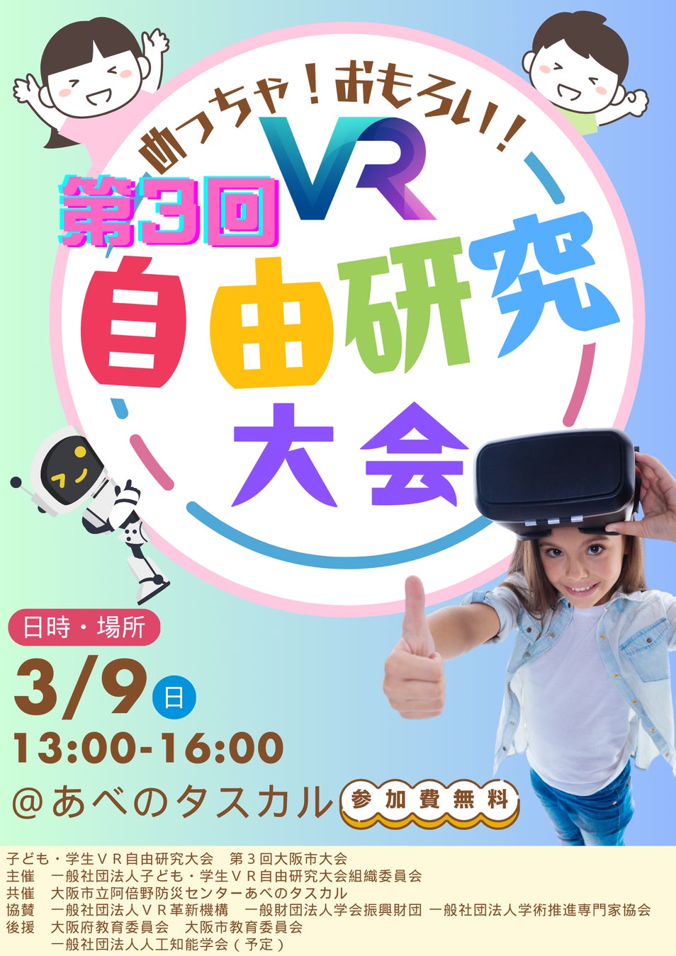 一般社団法人子ども・学生VR自由研究大会組織委員会(本社:東京都千代田区、代表理事:横松繁)は、2025年3月9日(日)に「第3回大阪市子ども学生VR自由研究大会」を開催いたします。研究テーマは「防災」。阿倍野防災センターでの体験学習を基に、VR技術を活用した防災研究を子どもたちが発表します。