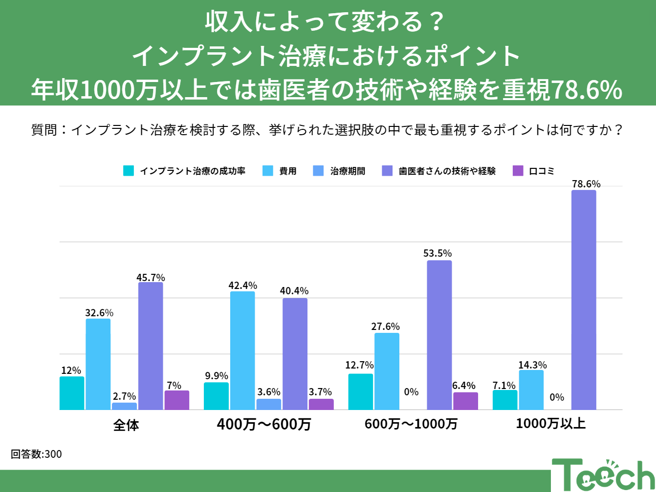実際、この収入層での歯医者さんの技術や経験への重視は78.6%にものぼるの対し、費用への関心は14.3%に留まっています。