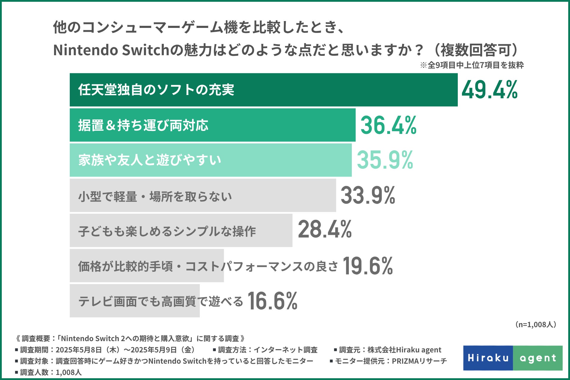 「他のコンシューマーゲーム機を比較したとき、Nintendo Switchの魅力はどのような点だと思うか」と尋ねたところ、『任天堂独自のソフトの充実(49.4%)』が最多で、『据置&持ち運び両対応(36.4%)』『家族や友人と遊びやすい(35.9%)』となりました。
