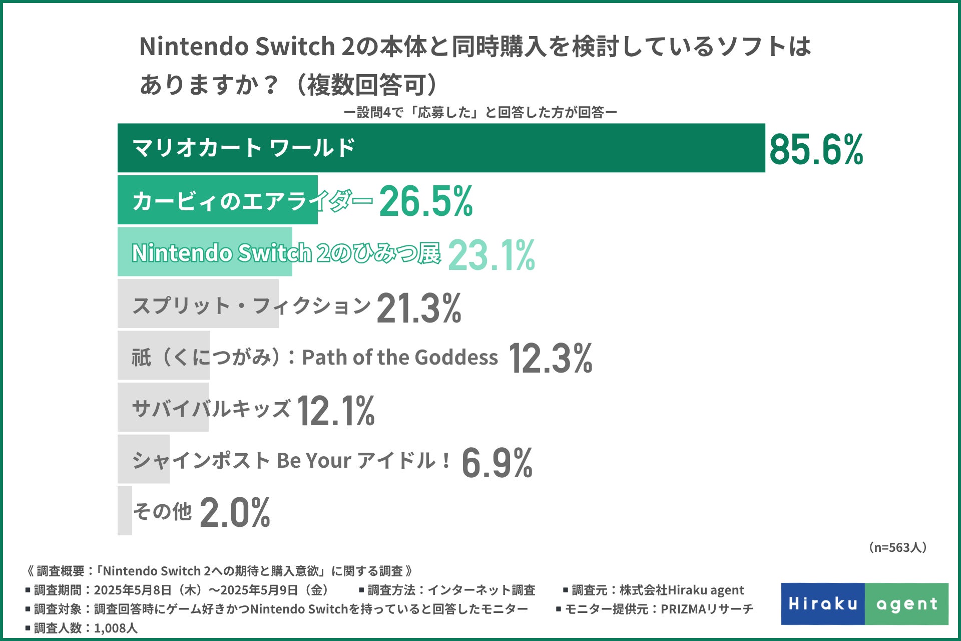 同時購入を検討するソフトでは、「マリオカート ワールド」が圧倒的な支持を受けており、幅広い世代に愛されるブランドタイトルの強さが示されました。