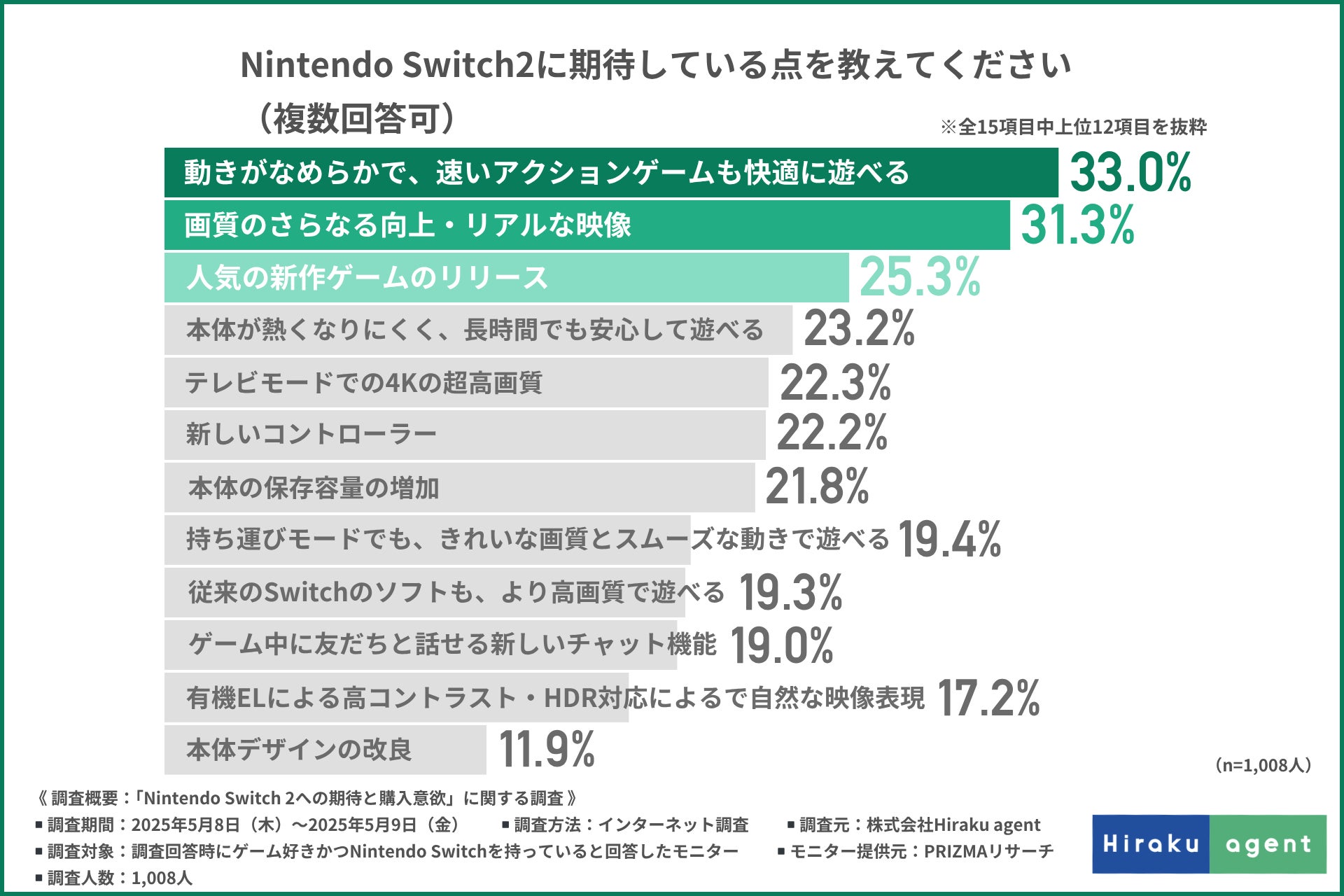 「Nintendo Switch 2に期待している点」について尋ねたところ、『動きがなめらかで、速いアクションゲームも快適に遊べる(33.0%)』が最多で、『画質のさらなる向上・リアルな映像(31.3%)』『人気の新作ゲームのリリース(25.3%)』となりました。