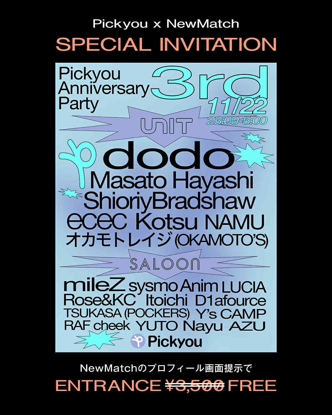 インフルエンサーが出品するフリマアプリ『Pickyou(ピックユー)』を運営する株式会社ピックユー(本社:東京都渋谷区、代表取締役:冨田理央、以下:ピックユー)は、「友だちから始まる新しい出会い」をテーマにしたSNS『NewMatch(ニューマッチ)』を運営するONE株式会社(本社:東京都渋谷区、代表取締役:畠中理弥、以下:ONE)と、2025年11月22日(土)に開催される「Pickyou 3rd Anniversary Party」にて、両社の初となるコラボレーション企画を実施します。当日は、NewMatchのプロフィール画面を受付で提示すると、通常3,500円のエントランス料金が無料になります。