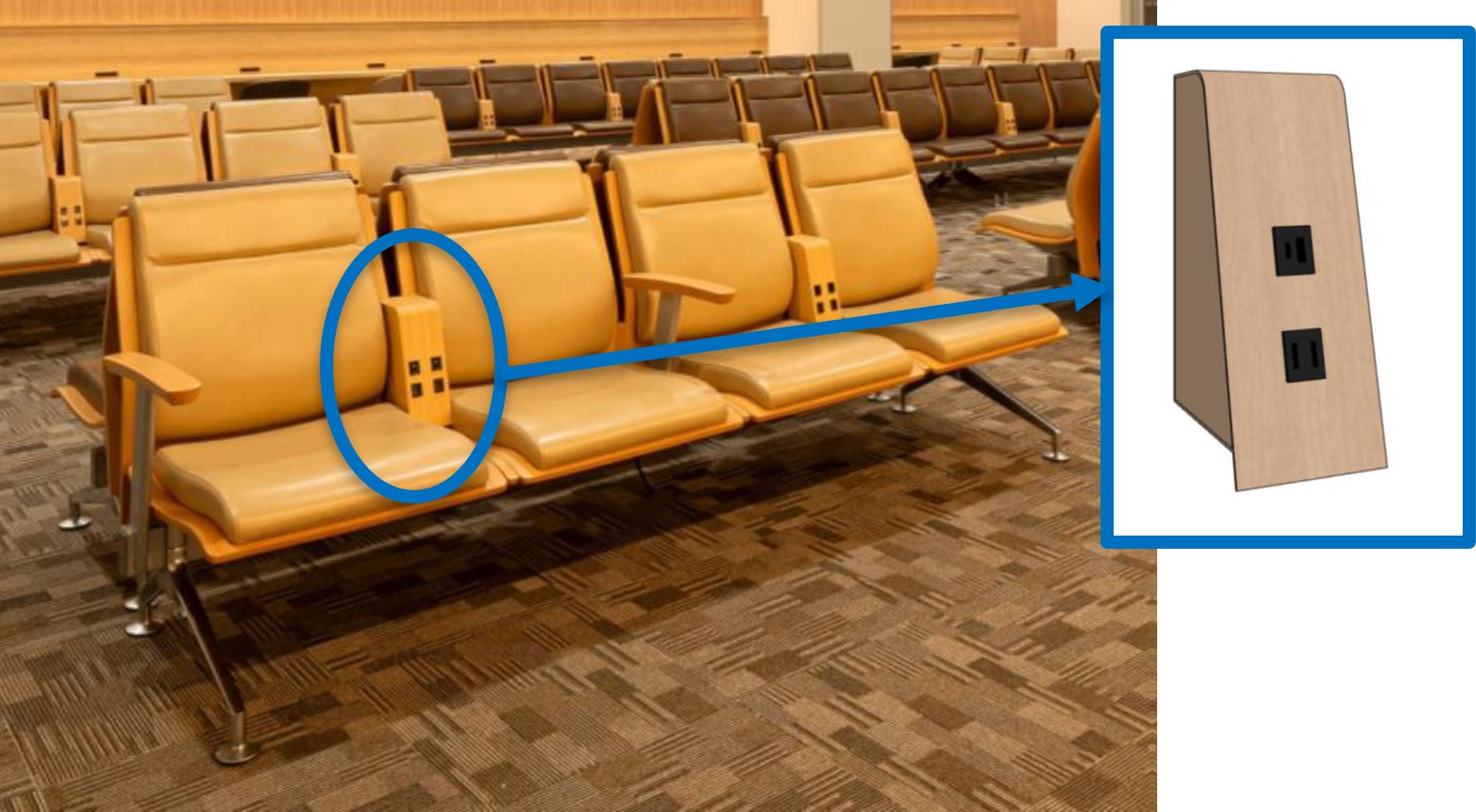 搭乗待合室内のロビーチェア増設や充電設備拡充を行い、利便性を向上。