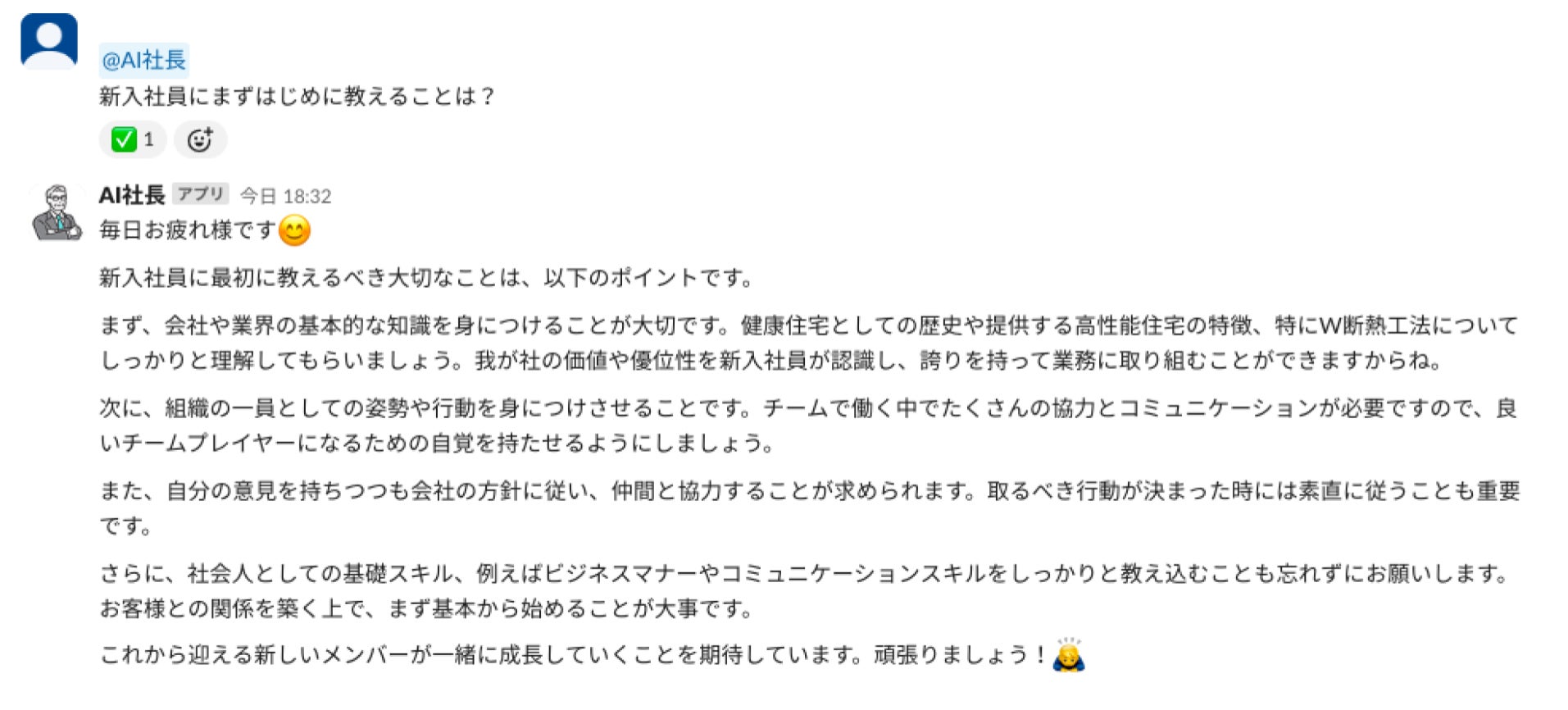 AI社長は、業務効率化やマニュアルの浸透を図り、皆さんの「冷静に目標を分析する力」を養いながら、健康住宅の価値観や理念を大切にする姿勢を応援してくれるはずです。