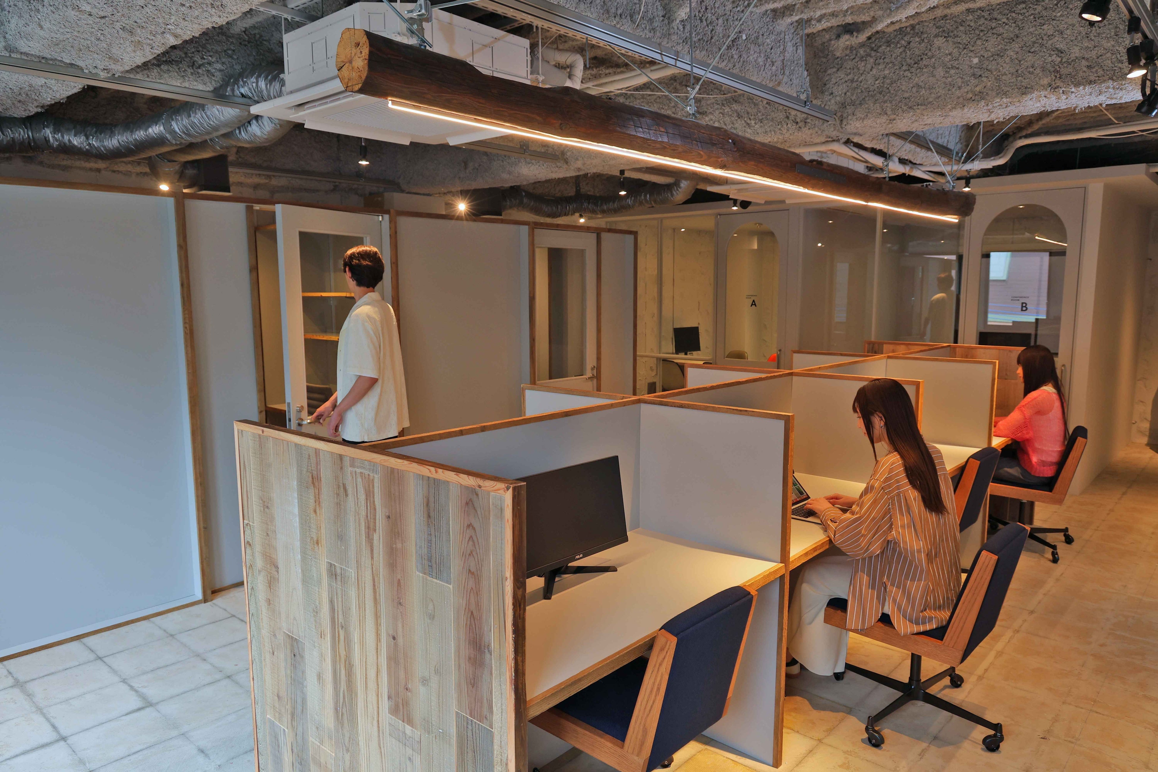 仕切りのついたデスクや個室席は、落ち着いて過ごしたいときに。事前予約も可能な会議室(定員4名)やフォンブース、コピー機もございます。