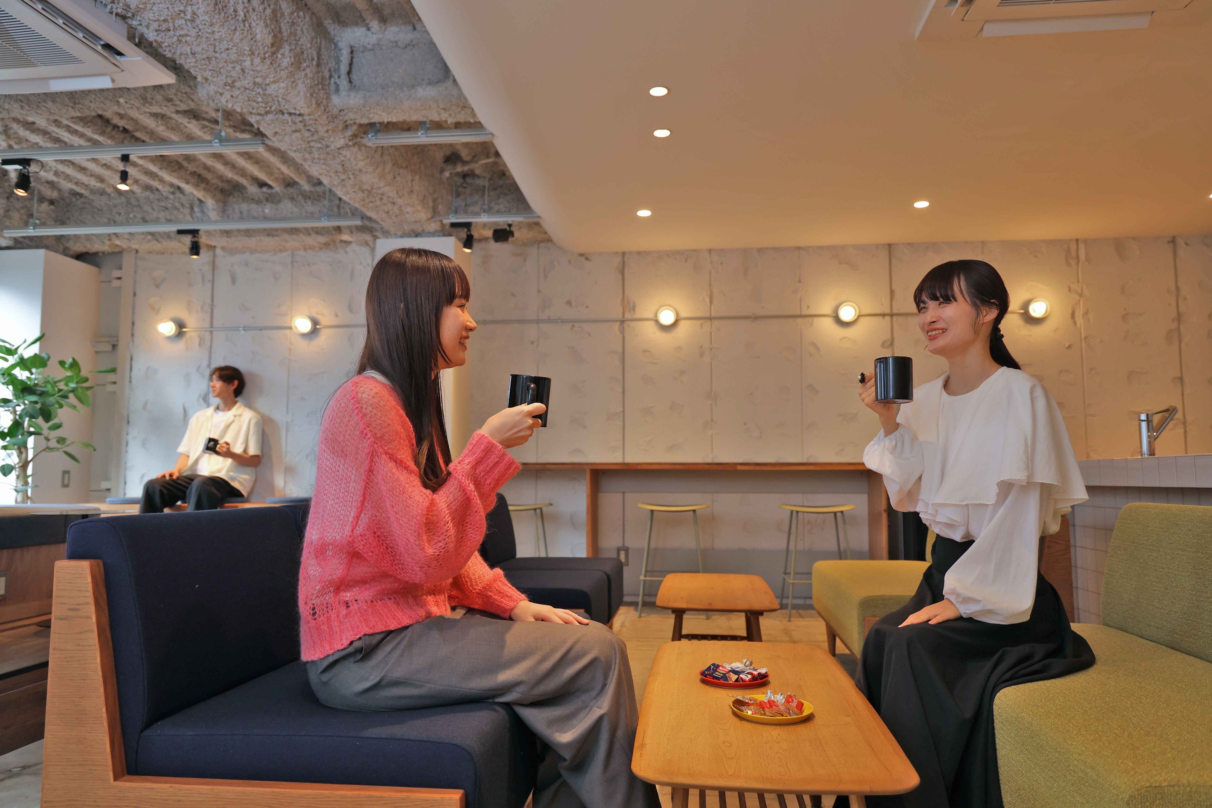 各種ドリンクやスナック、ベーグルを自由にお楽しみいただけます。ゆったり座れるソファ席は、ランチやミーティングにぴったり。スタッフが駐在する受付もこちら。