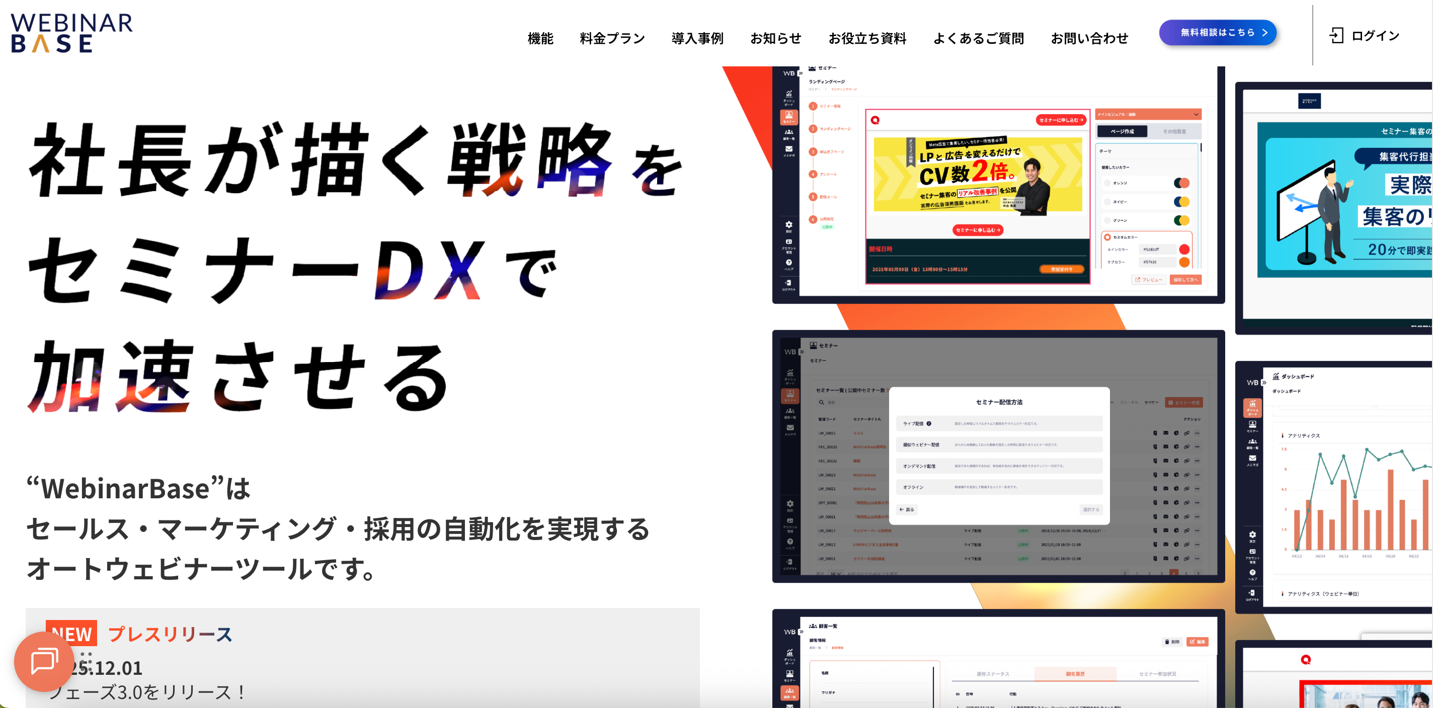WebinarBaseは営業、マーケティング、採用活動を自動化するオールインワンのウェビナーツールです。 ランディングページ作成、メール配信、CRMなど、ウェビナー運営に機能を一つのプラットフォーム。
