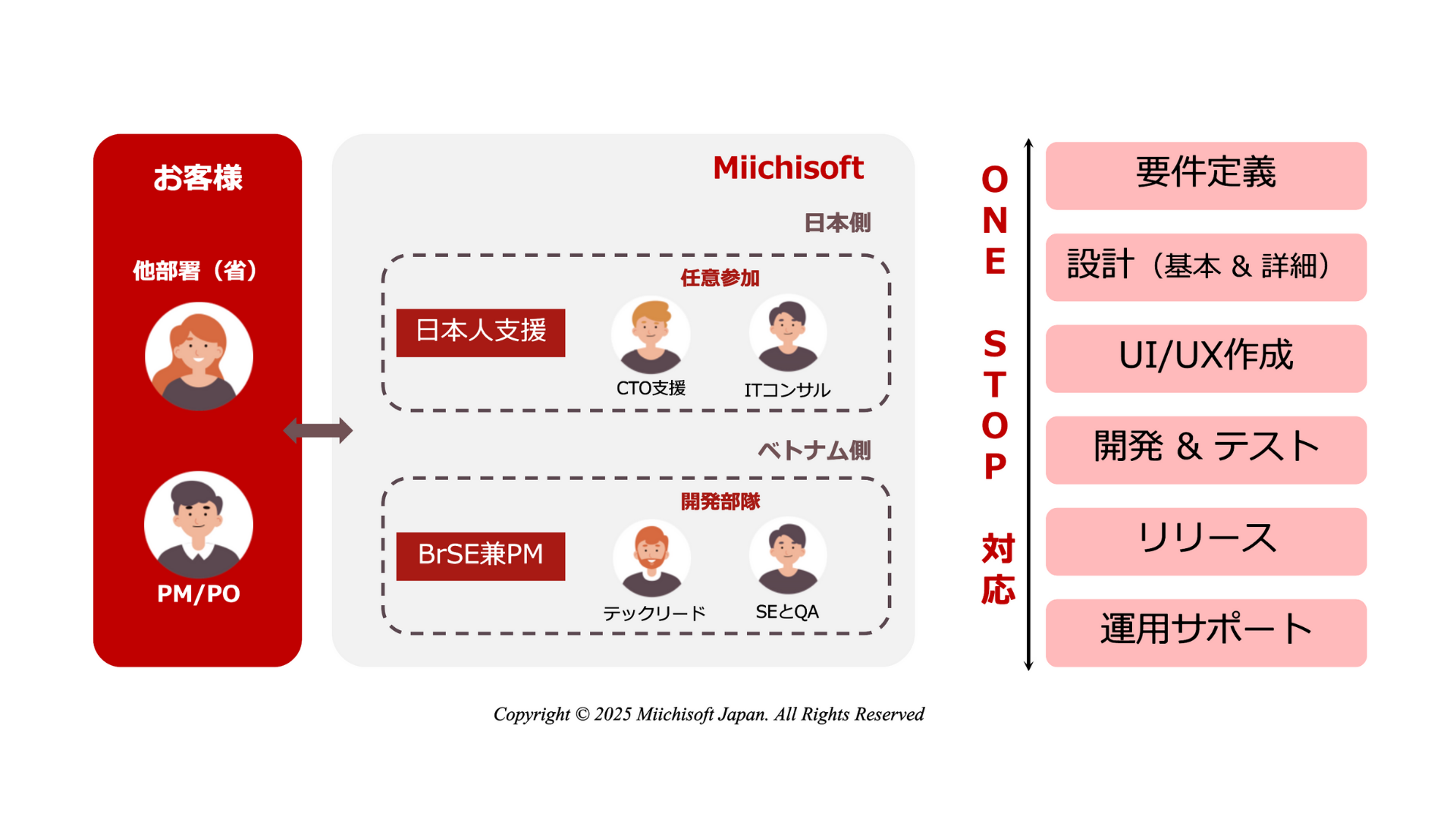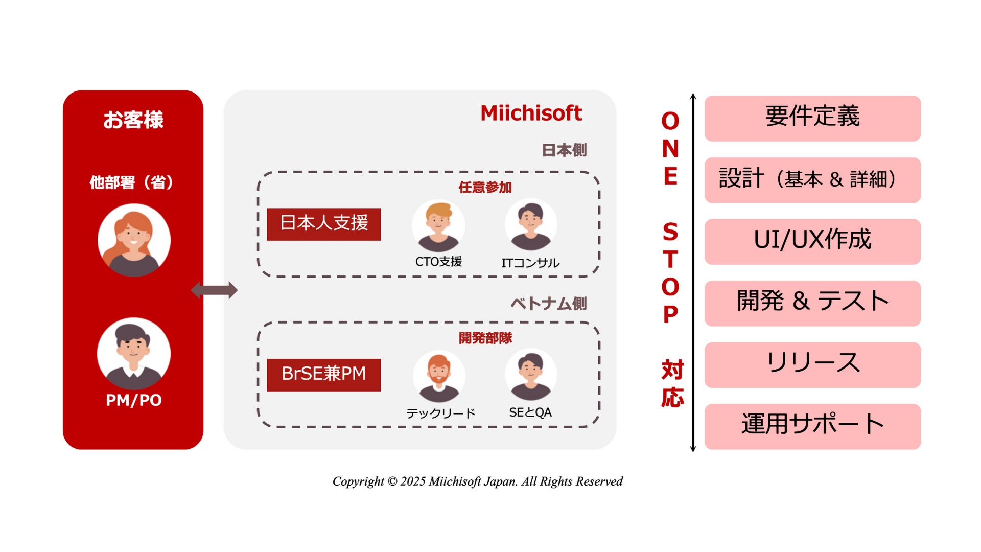 また、日本人アドバイザーが常時参画する専用のリモートチーム体制を構築し、日本企業の業務慣習や文化にも配慮した円滑な開発を実現しています。