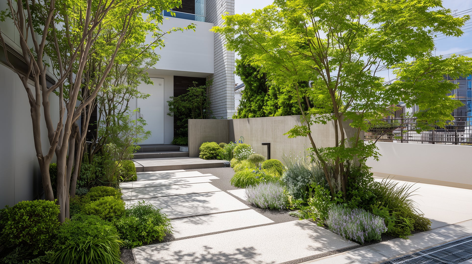 門柱・アプローチ・植栽計画・照明デザインまで幅広く表現。