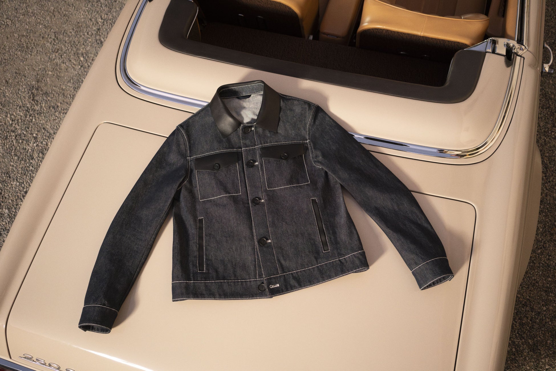 デニムのコードは、レザー、ダウン、ダブルフェイスジャージーといった多様な素材に巧みに落とし込まれており、各ピースが互いにリンクする統一感のあるストーリーを紡ぎ出しています。