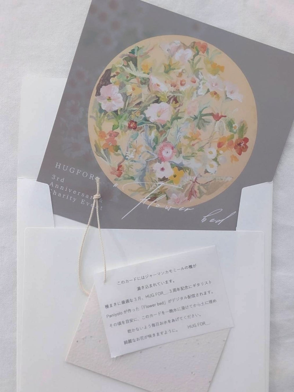 このたび、HUG FOR_. 3周年のイベント名と、庄島歩音の作品名「Flower bed」 にちなんだ曲「Flower bed 」を、ギタリストの Paniyoloが制作。曲は会場で初披露され、その曲とともに小さな花の種を和紙に漉き込んだシードペーパーをグリーティングカード代わりにお配りします。お渡しする紙には、ジャーマンカモミールの種が含まれており、水に浸し土に植えると、眠っていた種が芽吹き、やがて小さな花を咲かせます。ちょうどその頃、Paniyolo作曲の「Flower bed」もデジタル配信される予定です。