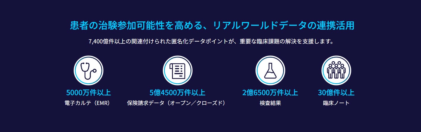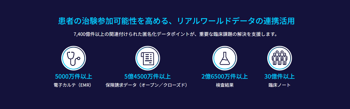 7,400億件以上の関連付けられた匿名化データポイントが、重要な臨床課題の解決を支援、【業界最大級を誇るリアルワールドデータアセット】で、臨床試験計画を強力に支援いたします。