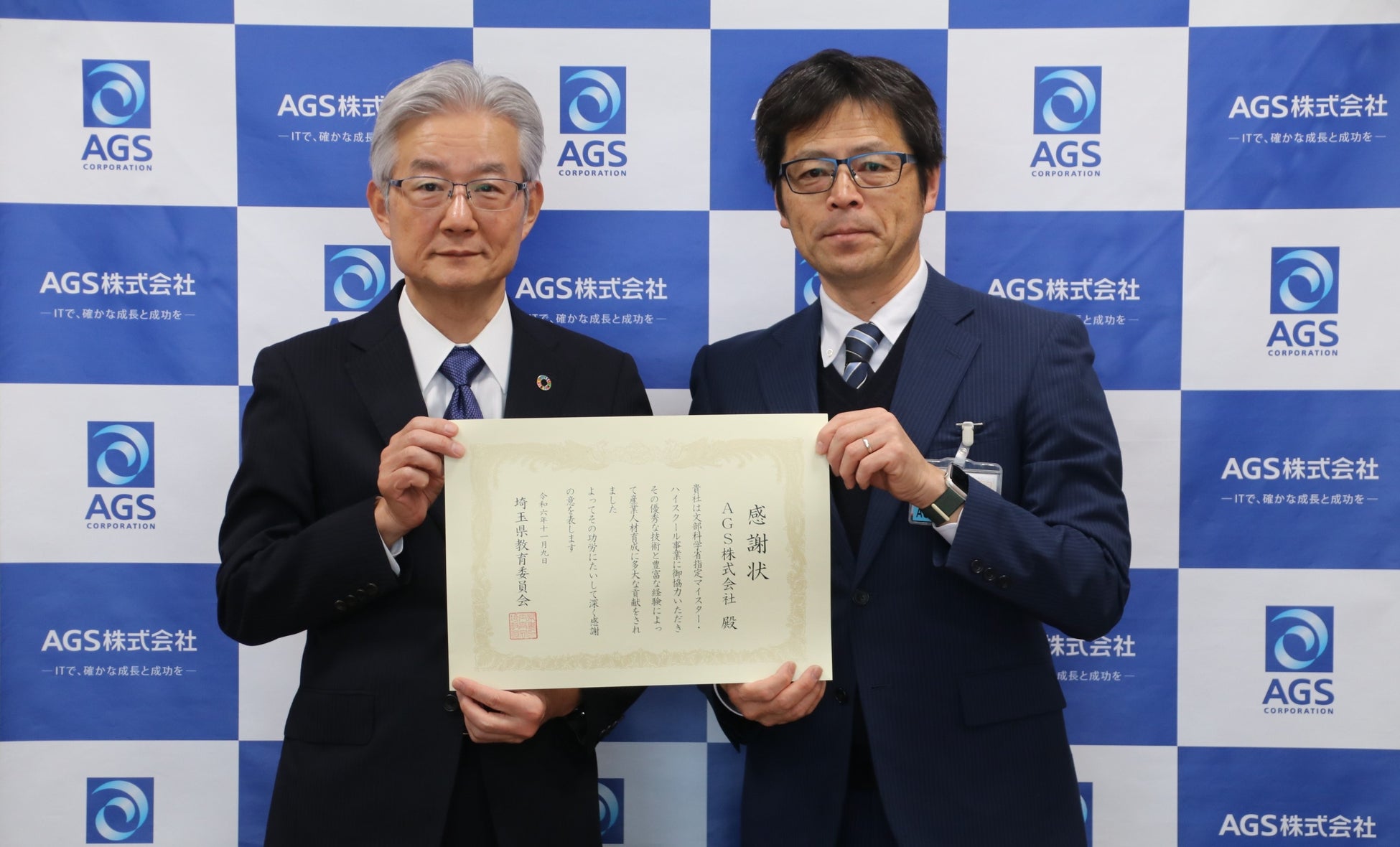 AGS株式会社(本社:埼玉県さいたま市、代表取締役社長:中野 真治、以下当社)は、今般、埼玉県立大宮工業高等学校(以下大宮工業高校)へのマイスター・ハイスクール事業(※1)の取り組みが評価され、同校より感謝状を拝受しました。当社はこれまで、大宮工業高校に対し、「マイスター・ハイスクール CEO」としての社員派遣やRPA(※2)の授業、同校教員への教育などの活動を行って参りました。