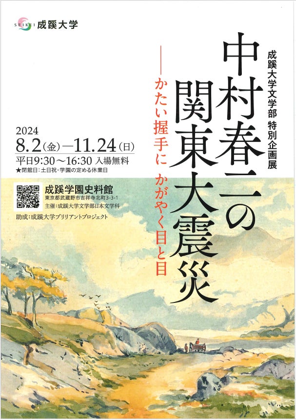 成蹊大学(東京都武蔵野市、学長:森雄一)は、文学部日本文学科主催の特別企画展「中村春二の関東大震災―かたい握手に かがやく目と目」を、2024年8月2日(金)から11月24日(日)まで、成蹊学園史料館(東京都武蔵野市)にて開催する。