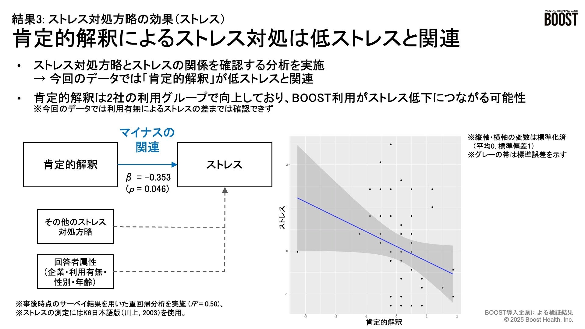 BOOSTの利用を通じて、出来事を否定的に捉えすぎず、建設的に解釈する力「肯定的解釈」が強化され、従業員のストレス低下に繋がると考えられます。