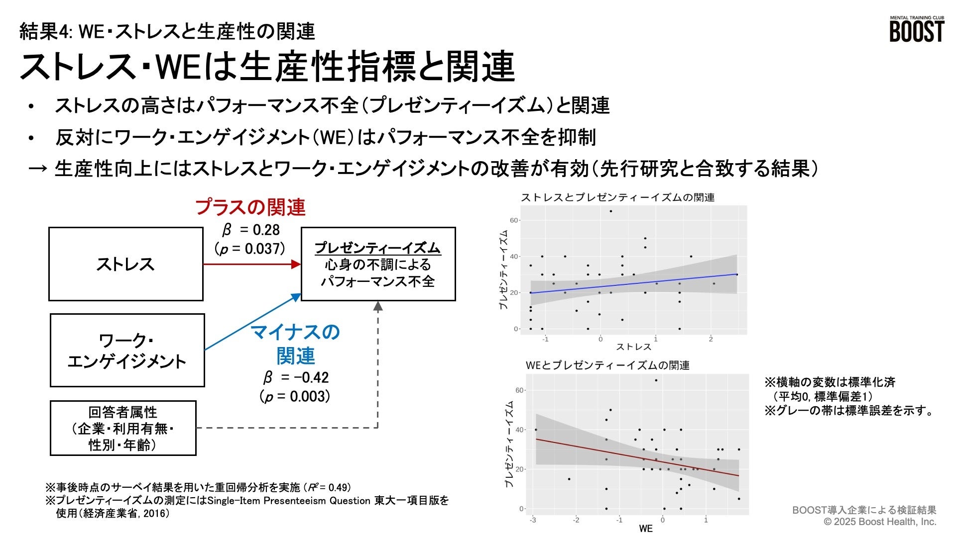 以下のBOOST利用後の数値結果から、従業員1人1人のワークエンゲイジメントが高く、ストレスに適切に対処できること(ストレス負荷が高すぎないこと)は、従業員の生産性向上につながる可能性を確認しています。