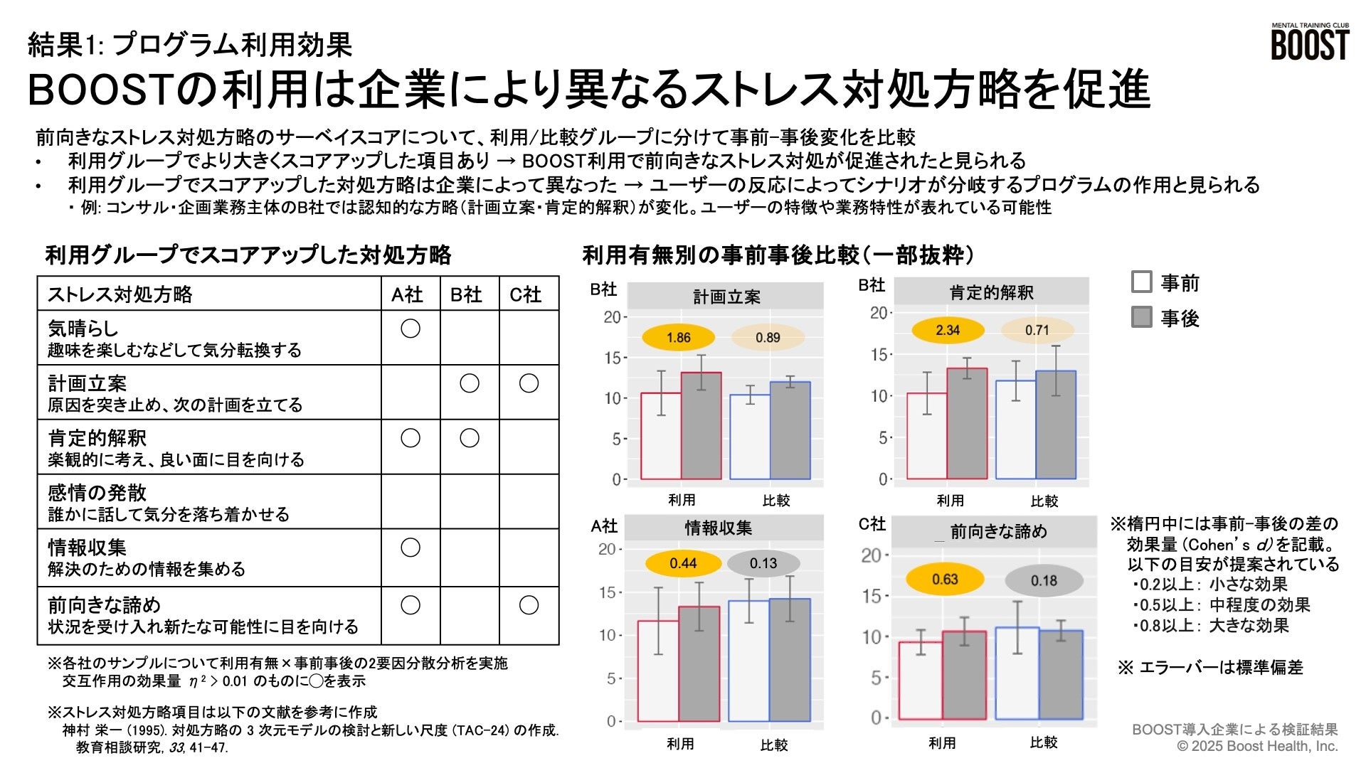 BOOST利用グループでは、前向きなストレス対処方略(計画立案・肯定的解釈・情報収集・前向きな諦め)において比較グループよりも大きな効果量が認められました。