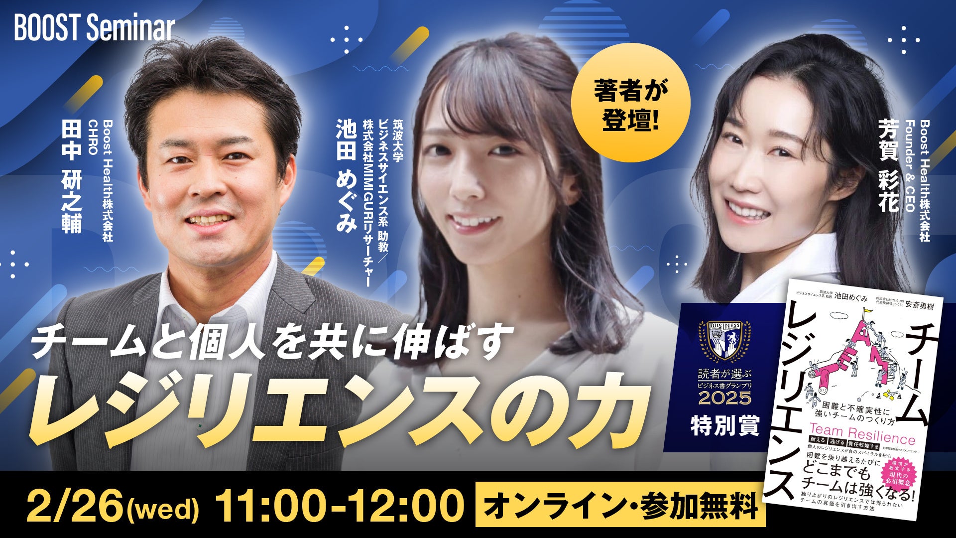 池田 めぐみ 氏 (筑波大学 ビジネスサイエンス系 助教/株式会社MIMIGURI リサーチャー) 田中 研之輔 (Boost Health株式会社 CHRO/法政大学キャリアデザイン学部教授) 芳賀 彩花 (Boost Health株式会社 Founder & CEO) |