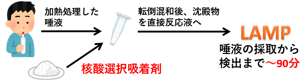 長嶺教授らは、唾液に核酸選択吸着剤(ハイドロキシアパタイト誘導体)を混ぜることで核酸と核酸選択吸着剤の複合体を形成させ、その沈殿物をLAMP反応液(核酸増幅反応液)に加えることで核酸の解離と増幅反応を同時に行い、口腔内細菌を60~90分程度で検出できるようにしました。