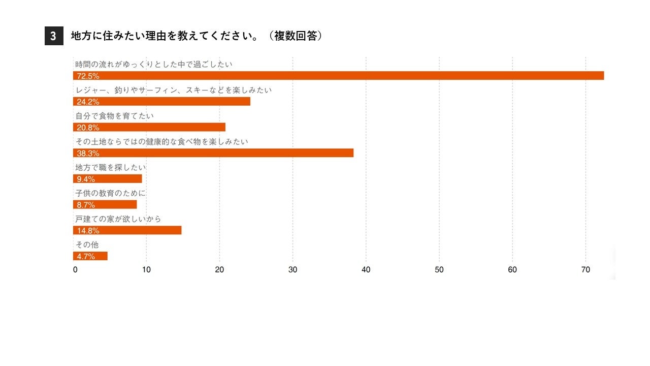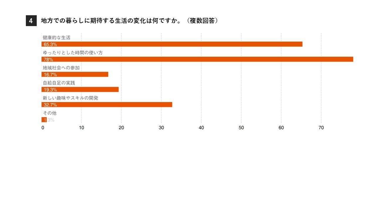 地方移住について、将来のために今から準備をしたいという回答が71.4%あった。そんな地方移住に期待することは「ゆったりとした時間の使い方(78%)「健康的な生活(65.3%)」と、せわしない都会暮らしから解放され、自然を感じながらゆったりと暮らすことだと考えられる。