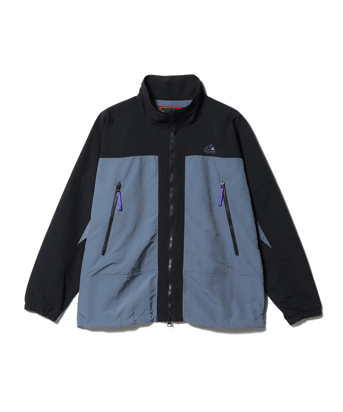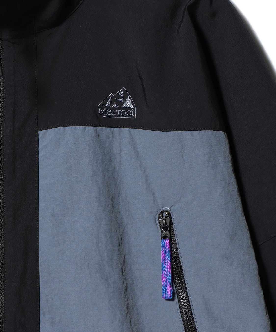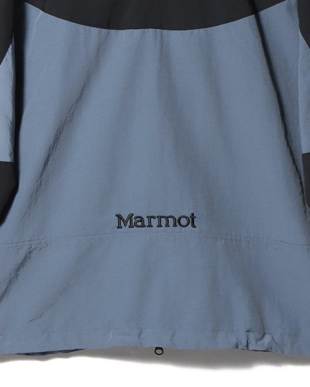 Marmotのロゴには、通常ラインでは展開されていない90年代中期に限定的に使用されていた旧ロゴを採用。インラインにはないこのモデル専用のカラーをセレクトし、ブルー×パープルのポケットの引手のコードもオリジナルカラーで製作しました。裾のドローコードは、馴染みやすいグレーに変更。アウトドアシーンだけでなく、どんなスタイルにも合わせやすいように、バックには刺繍のロゴデザインを施したブルゾンに仕上げています。