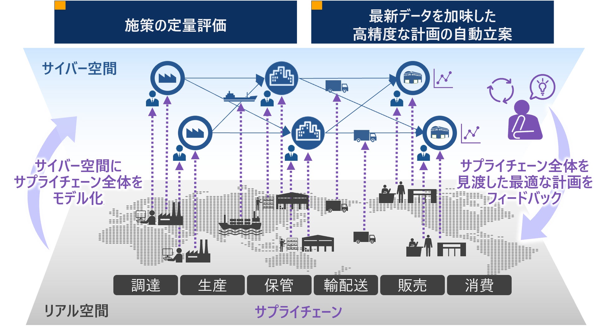 本基盤は、サイバー空間上にサプライチェーン全体をモデル化(デジタルツイン化)し、再現することにより、受注から調達・出荷・配送までの各種データを活用した施策評価や日々の最新データを加味した高精度な計画の自動立案を行います。具体的には、市場環境の変化に追従した需給調整案や輸送条件の変化などに即応した物流拠点変更案などの施策評価、仕入先への生産要求や適切な在庫計画などの自動立案が可能です。なお、本基盤は、流通業や製造業などに導入実績がある日立のLumada*1ソリューション「サプライチェーン最適化サービス*2,3」を活用しています。