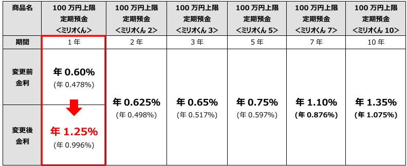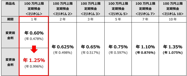 株式会社SBJ銀行(本店:東京都港区、代表取締役社長:並木 稔 「以下、当行」)は、お客さまのニーズにお応えするため、本日より、100万円上限定期預金<ミリオくん>につき、下記の通り金利を引き上げいたします。