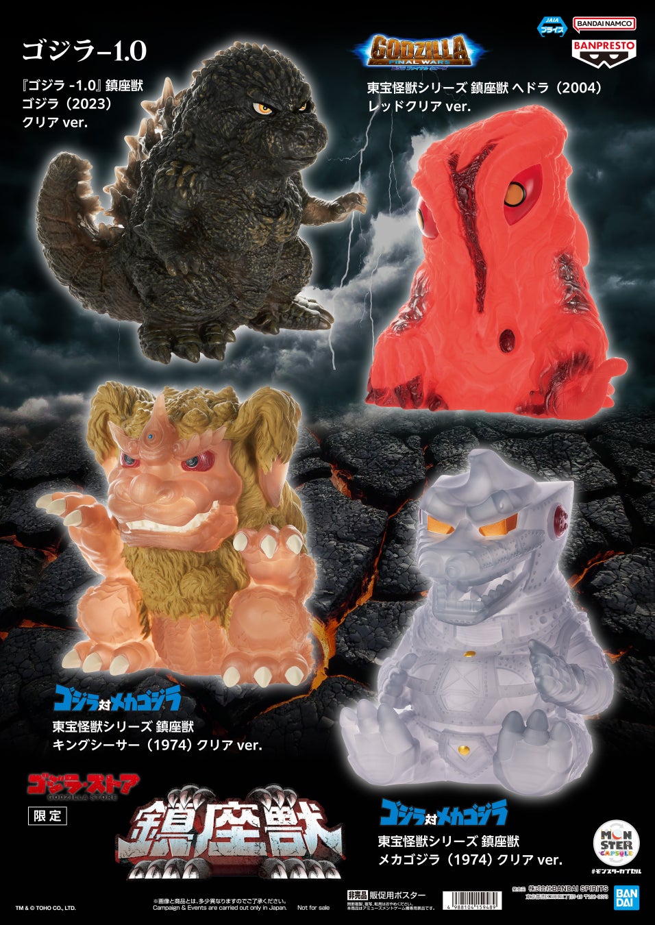 モンスターカプセルでは、ゴジラ・ストア Daibaでしか手に入らない限定カラーバージョンのデフォルメフィギュア「鎮座獣」シリーズを展開。一回3,300円(税込)で、以下の4種類の限定フィギュアのいずれかをゲットできます。